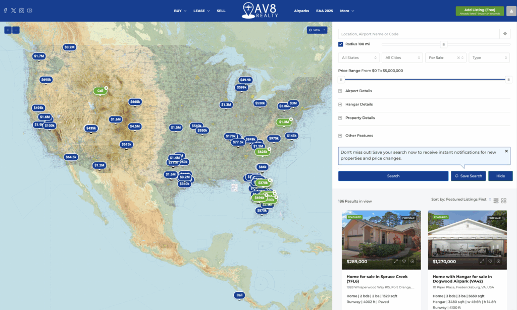 Oshkosh, WI – July 17, 2025 – AV8 Realty, the premier online platform specializing in aviation real estate, today announced a series of groundbreaking product launches aimed at simplifying the process of buying, selling, and leasing aviation properties. These innovations, powered by advanced AI technology, will be highlighted at EAA AirVenture 2025, the world’s largest aviation gathering, where AV8 Realty invites attendees to explore how these tools are transforming the niche market for airpark homes, hangars, private airports, and related properties.
