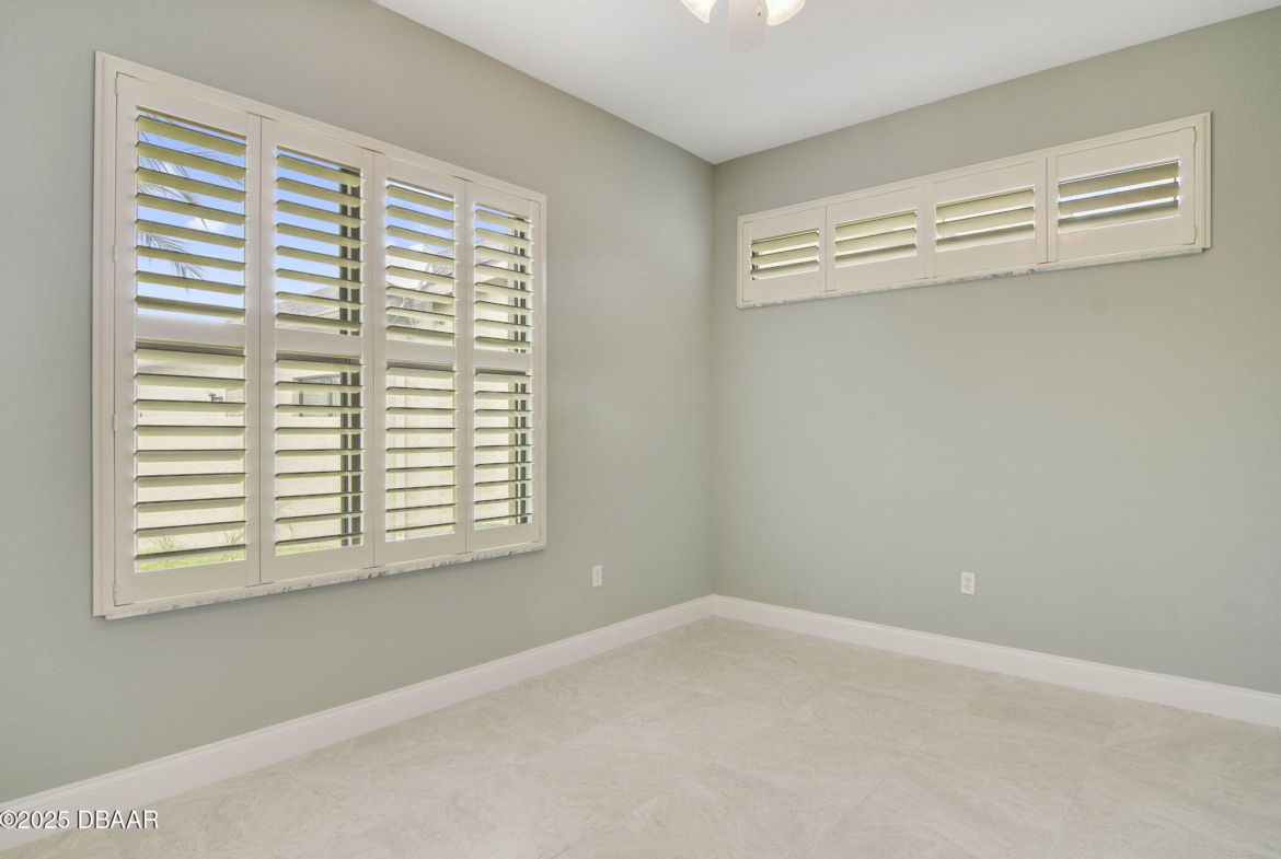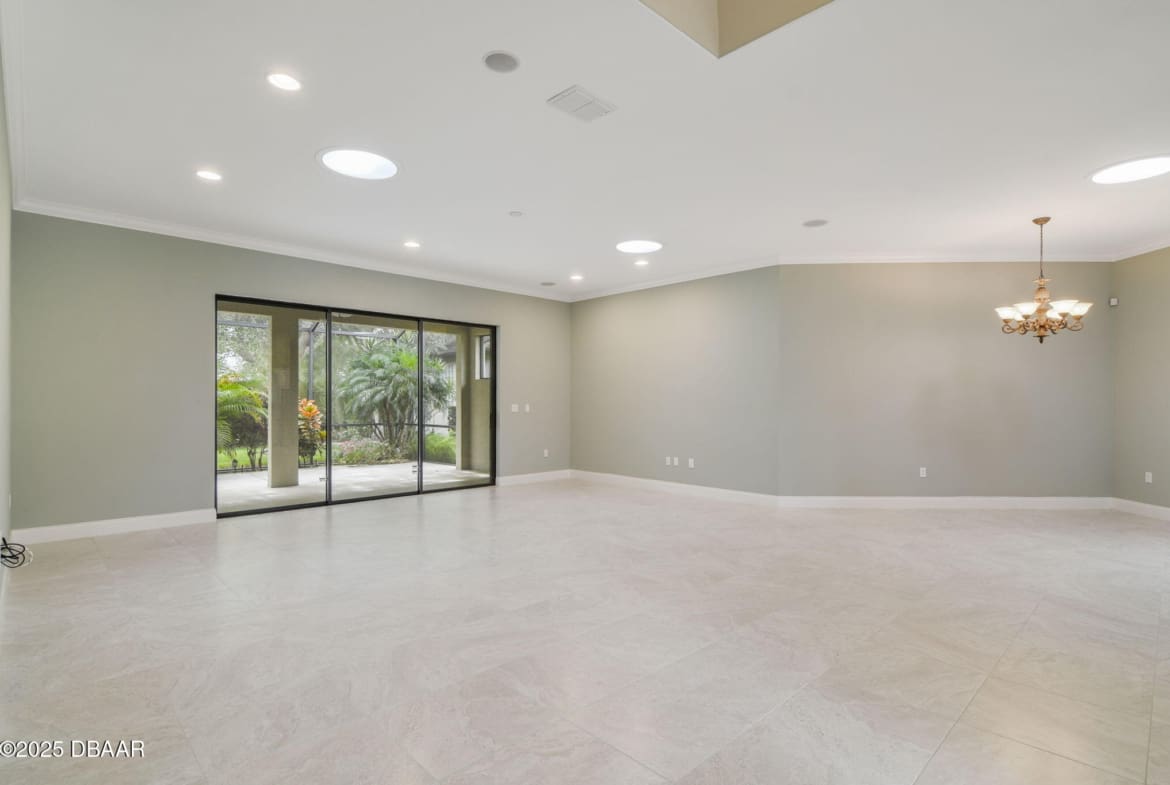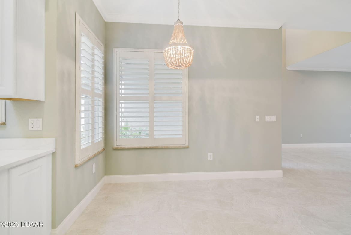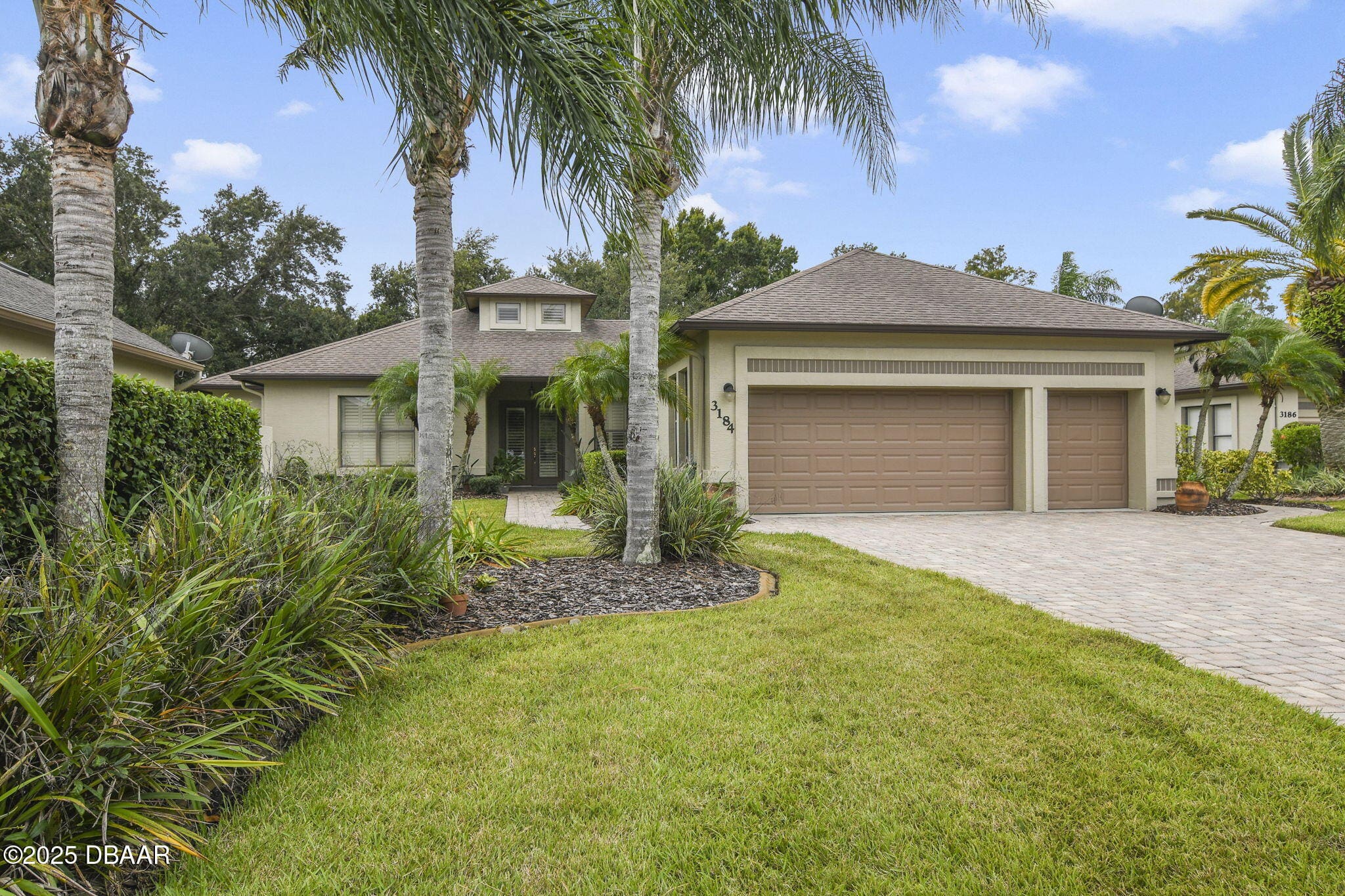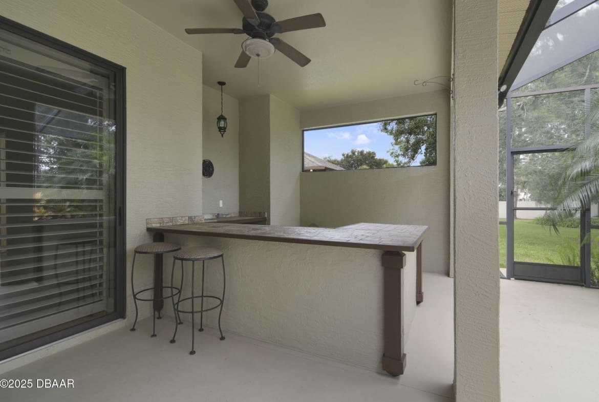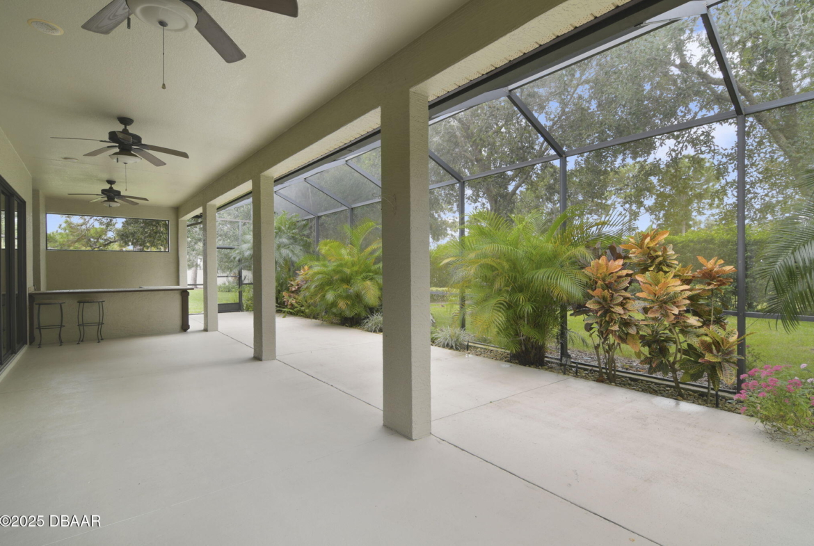 Welcome to Spruce Creek Fly-In, a premier aviation community offering the ultimate Florida lifestyle. As you approach this beautiful three-bedroom, two-bath home with a two-car plus golf cart garage, you’ll notice the paver driveway, elegant entryway, and lush tropical landscaping. As you step through the double doors, you are greeted by an open floor plan with tile flooring, triple glass sliding doors leading to the lanai, and refined details like plantation shutters and crown molding. The spacious kitchen features quartz countertops, white raised panel cabinetry, stainless steel appliances—including a wine cooler—crown molding, and modern recessed lighting. The primary suite offers a garden tub, walk-in shower, and a custom-designed walk-in closet. Two additional bedrooms share a well-appointed second bath, while the third bedroom includes its own private screened-in porch. Entertain in style on the extended 45-by-20-foot lanai,