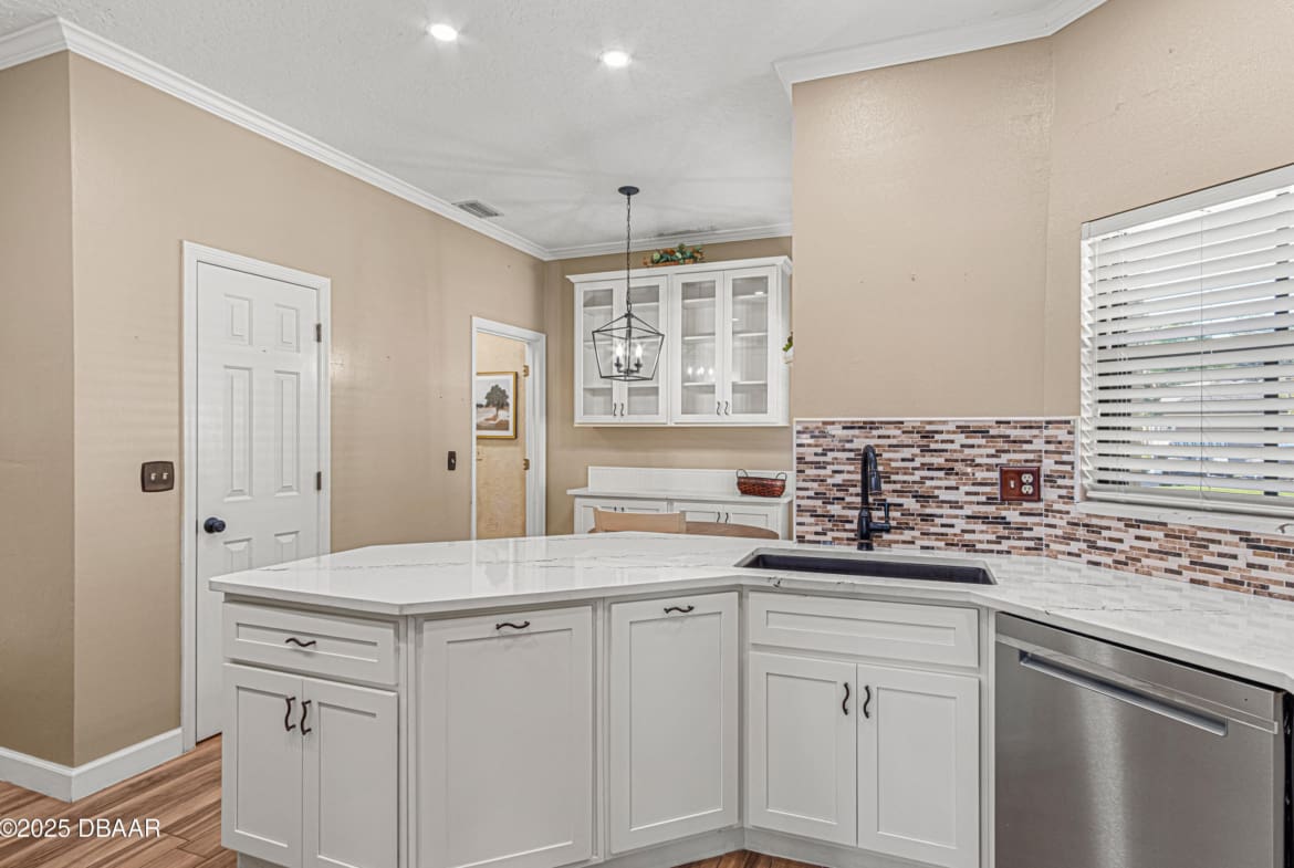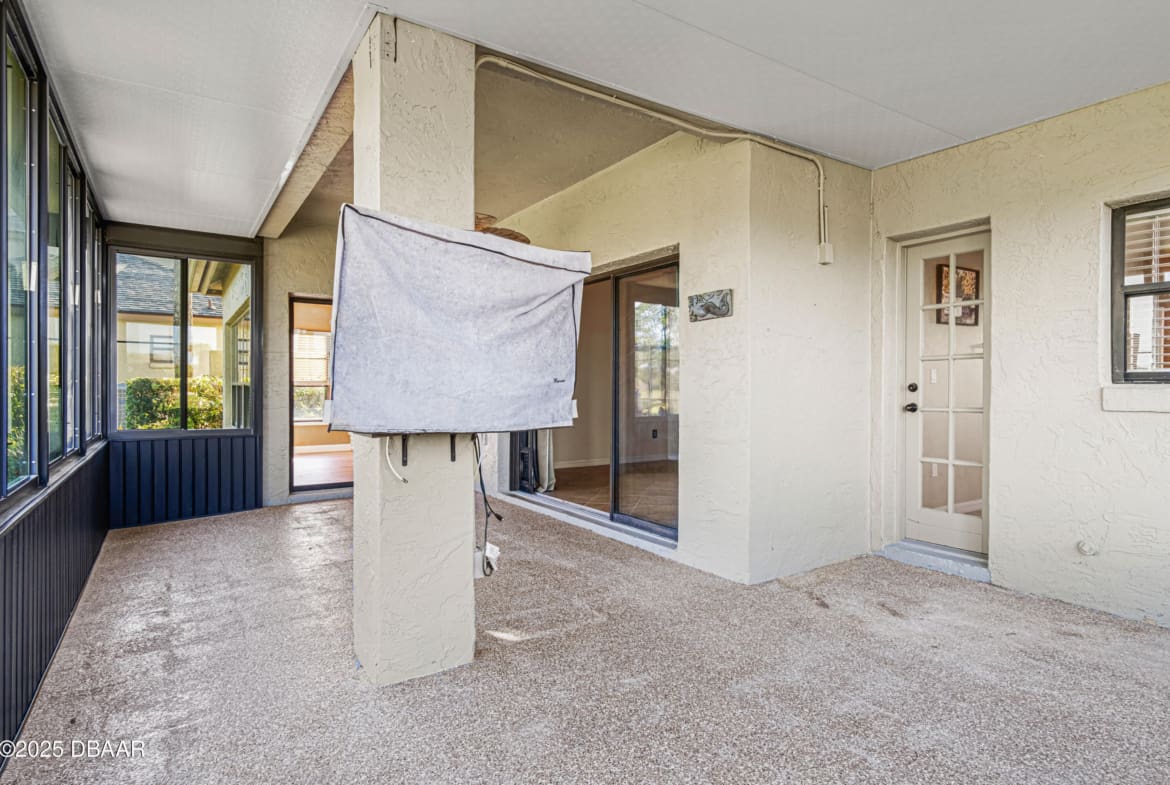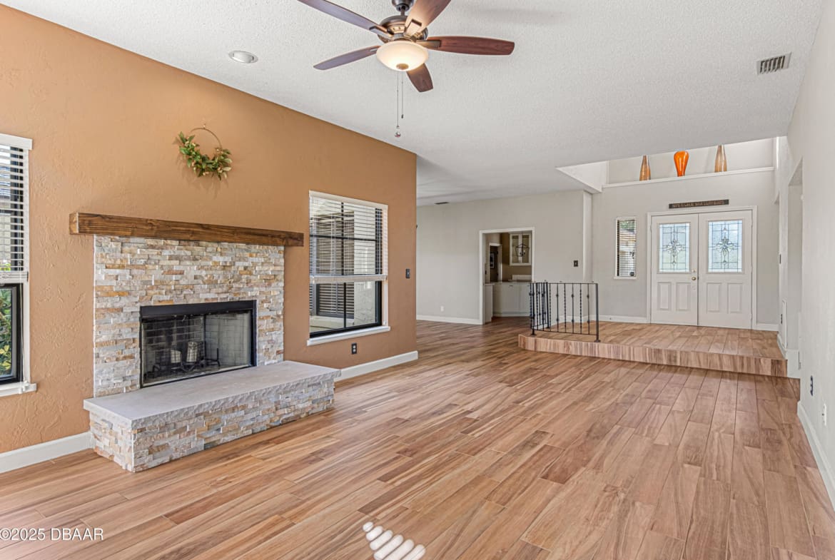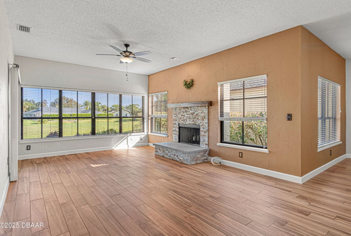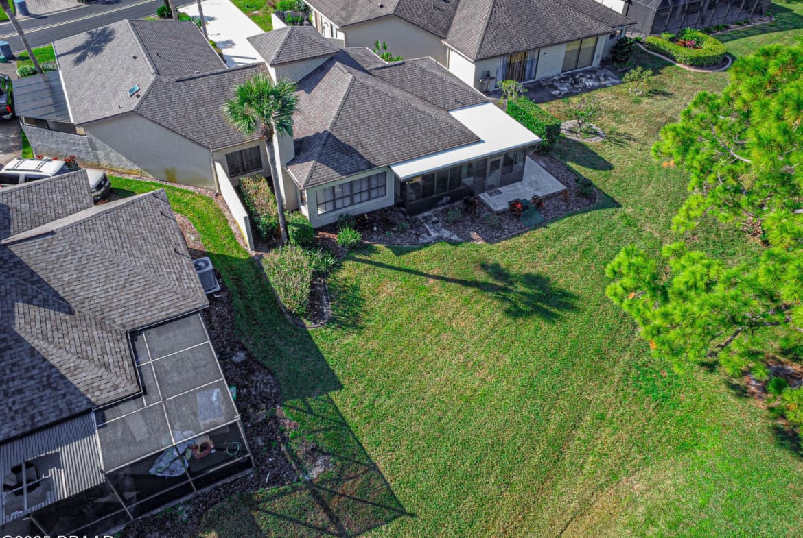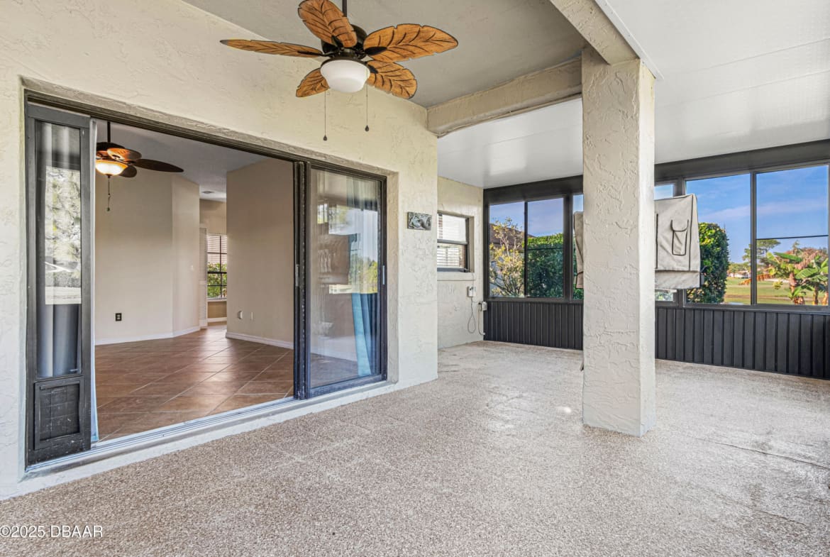 Enjoy fantastic golf course scenery from this Wedgewood property in Spruce Creek Fly-In gated community. Located in a cul-de-sac w/ abundant natural light & updates throughout. The stone fireplace in the family room overlooks spectacular views of the 17th tee/fairway as well as nature & pond views. Kitchen consists of beautiful custom cabinetry, quartz countertops, two pantries & newer stainless steel appliances. The primary suite includes his & her closets, dressing area, updated bath w/ access to a spacious & relaxing glass-panel enclosed lanai w/ insulated aluminum roof (2025). Guest suite offers a full bath, walk-in closet, private covered patio area w/ epoxy flooring & a separate entry from outside. The oversized garage has high-end epoxy flooring by Shark Coating w/ overhead storage. Additional Information: Updated landscaping, Freshly painted stained glass double front doors, Architectural shingle roof 2022, Tankless hot water heater 2019, 4-ton HVAC 2023,