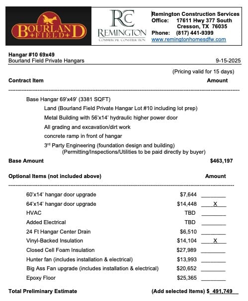69’ x 49’ (3381 sqft) Private Hangar at Bourland Field (50F) – Build to suit with several options. Customize as desired…