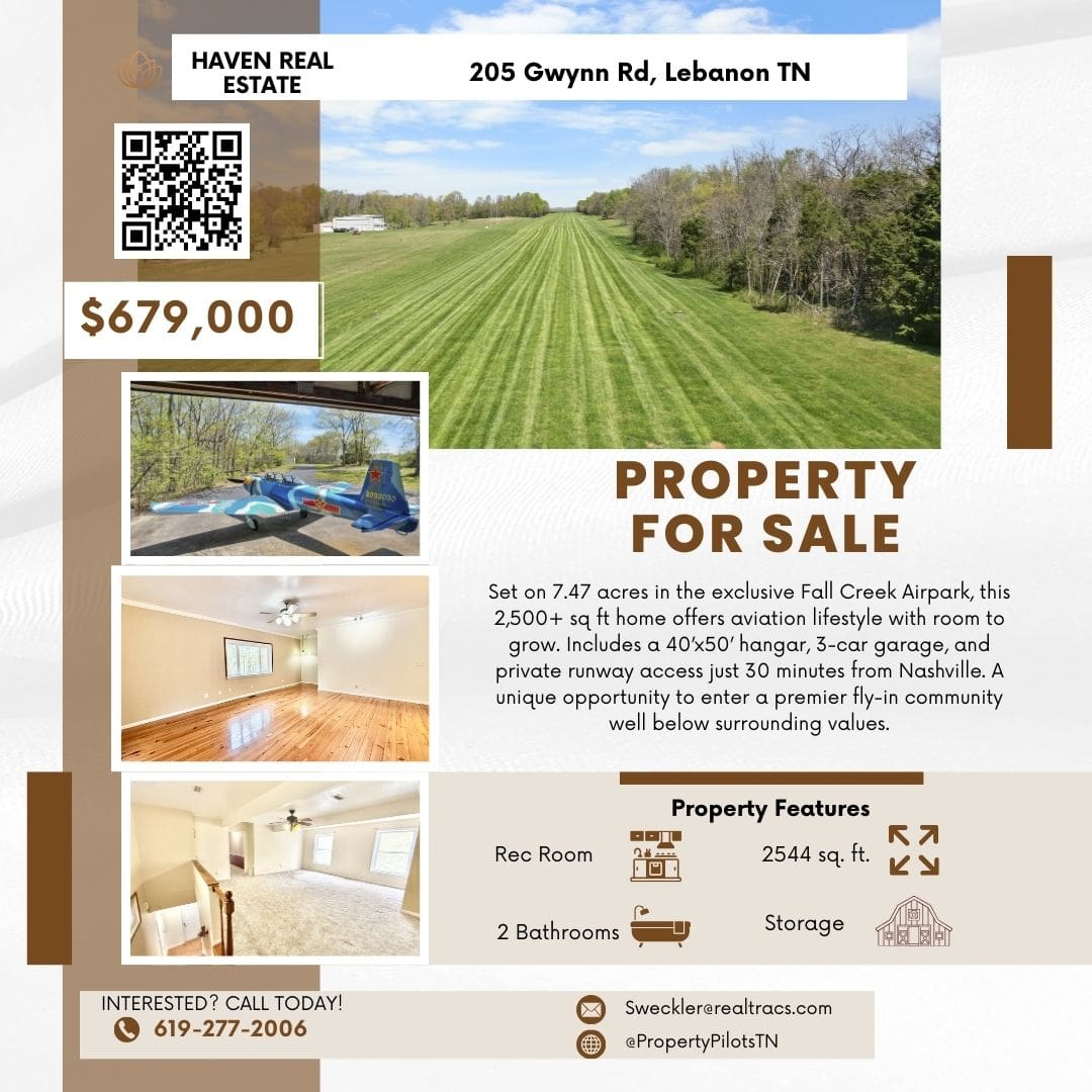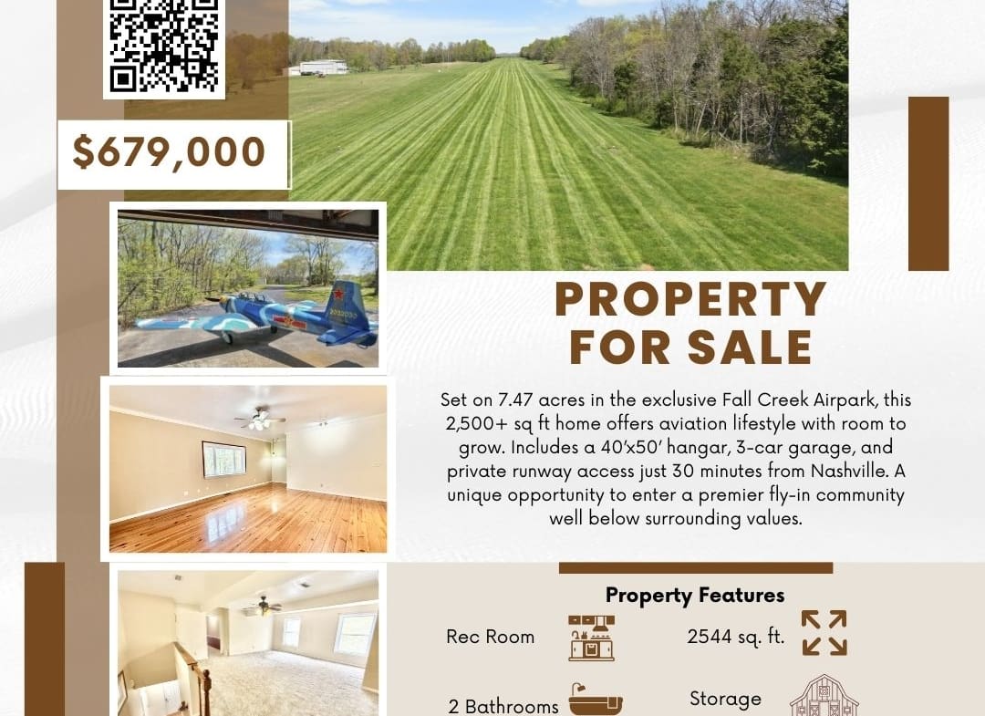 PRICE IMPROVEMENT – Rare Opportunity at Fall Creek Airpark (TN96) For the true aviation enthusiast, this is your chance to own in one of Middle Tennessee’s most exclusive aviation communities. Fall Creek Airpark is a 19-owner private community featuring a 2,700’ x 80’ grass runway with lighting, just outside Nashville’s Class C airspace and minutes from Lebanon, Mt. Juliet, Murfreesboro, and Smyrna. Nothing else like it exists this close to Nashville. The property offers a 40’ x 50’ hangar with a 12’ tall sliding door, a 3-car garage, and a home of just over 2,500 sqft on 7.5 acres. The house features 1 bedroom and 2 baths with open living, fireplace, and upper and lower decks. While it is in good condition, it is dated compared to many of the updated homes in Fall Creek that now command $1.3M–$1.8M. That makes this a rare entry point into the community, with significant equity potential for remodeling or even building new. Ownership here means you are part of the corporation that owns the airpark, not a typical HOA, giving you more flexibility to build, add a shop, or expand while enjoying runway access and community amenities. This is a unique opportunity to get into Fall Creek at a fraction of the price of neighboring properties and create your ideal airpark retreat.