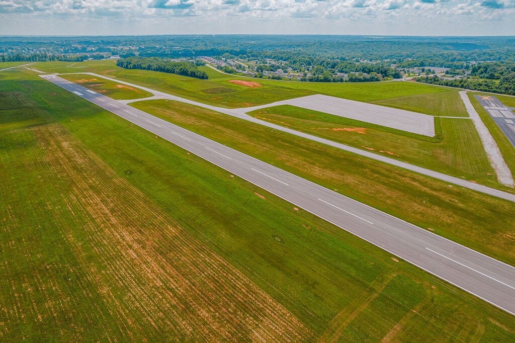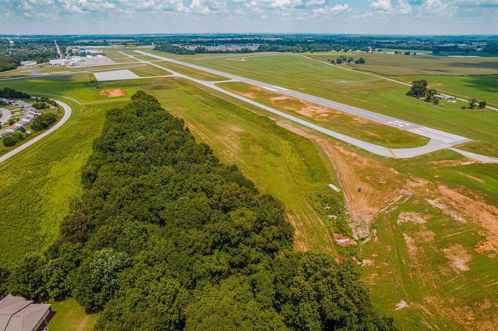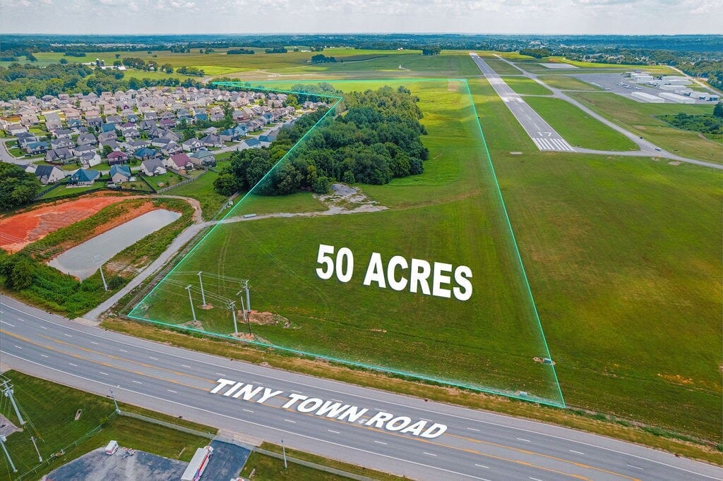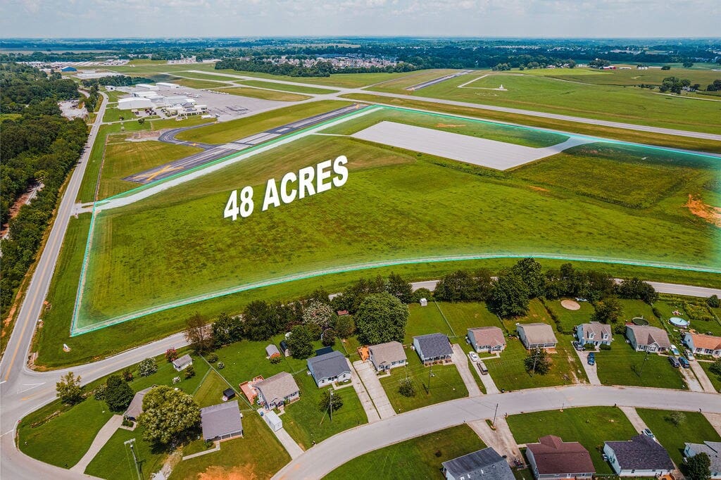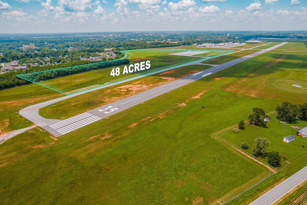 The first parcel offers 48 acres on the south side near the main entrance, while the second parcel features approximately 50 acres on the north side with frontage along Tiny Town Road. Both sites are directly adjacent to the 6,000-foot runway and full airport facilities.