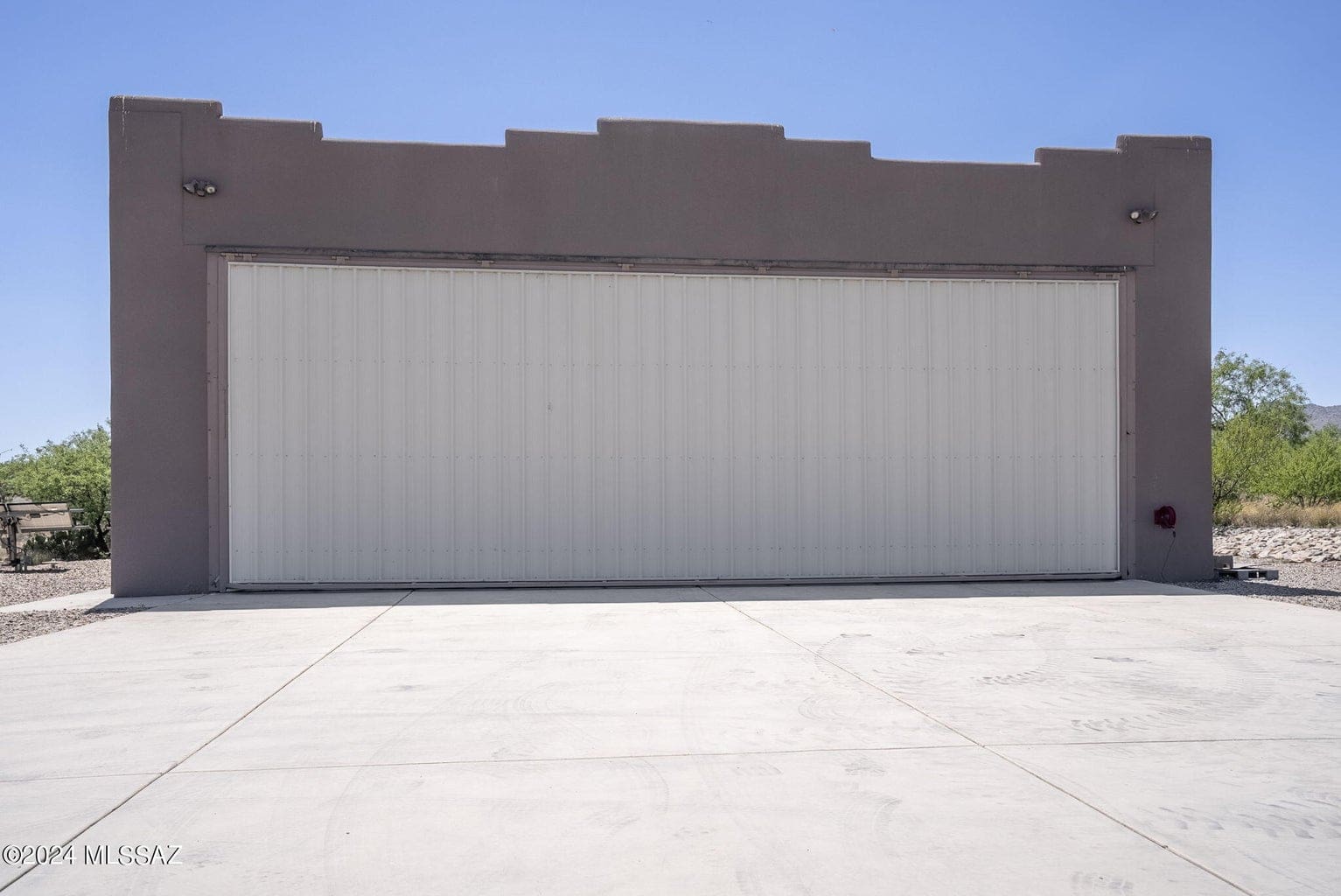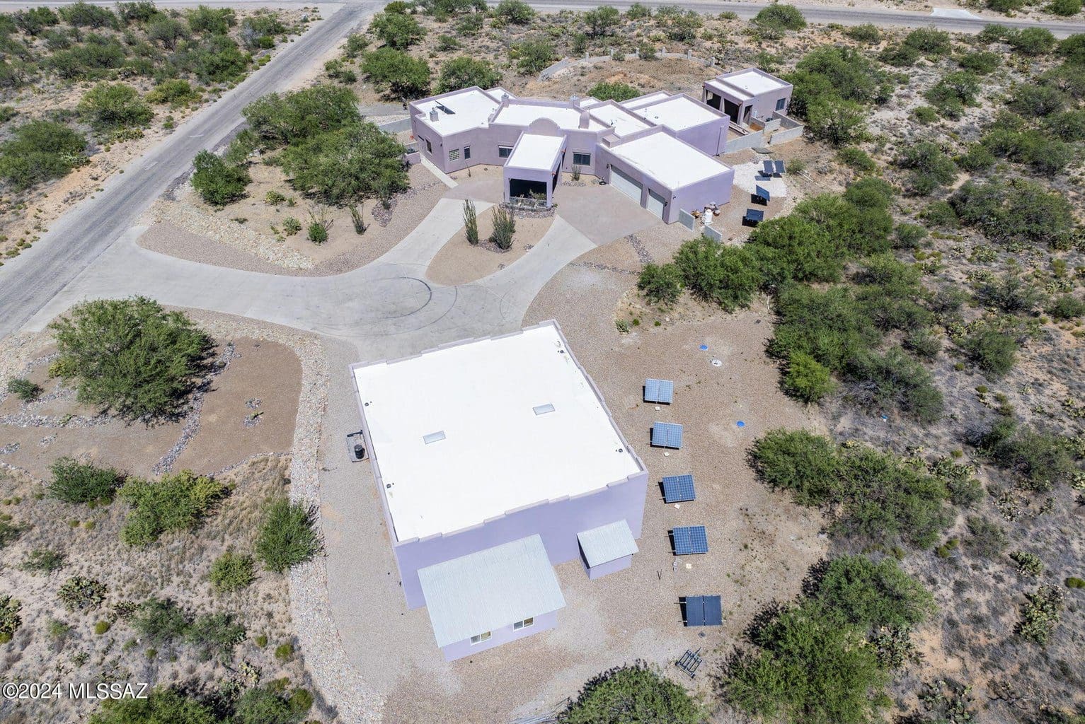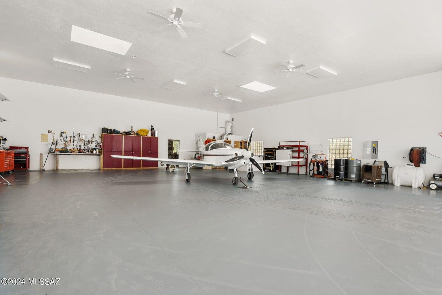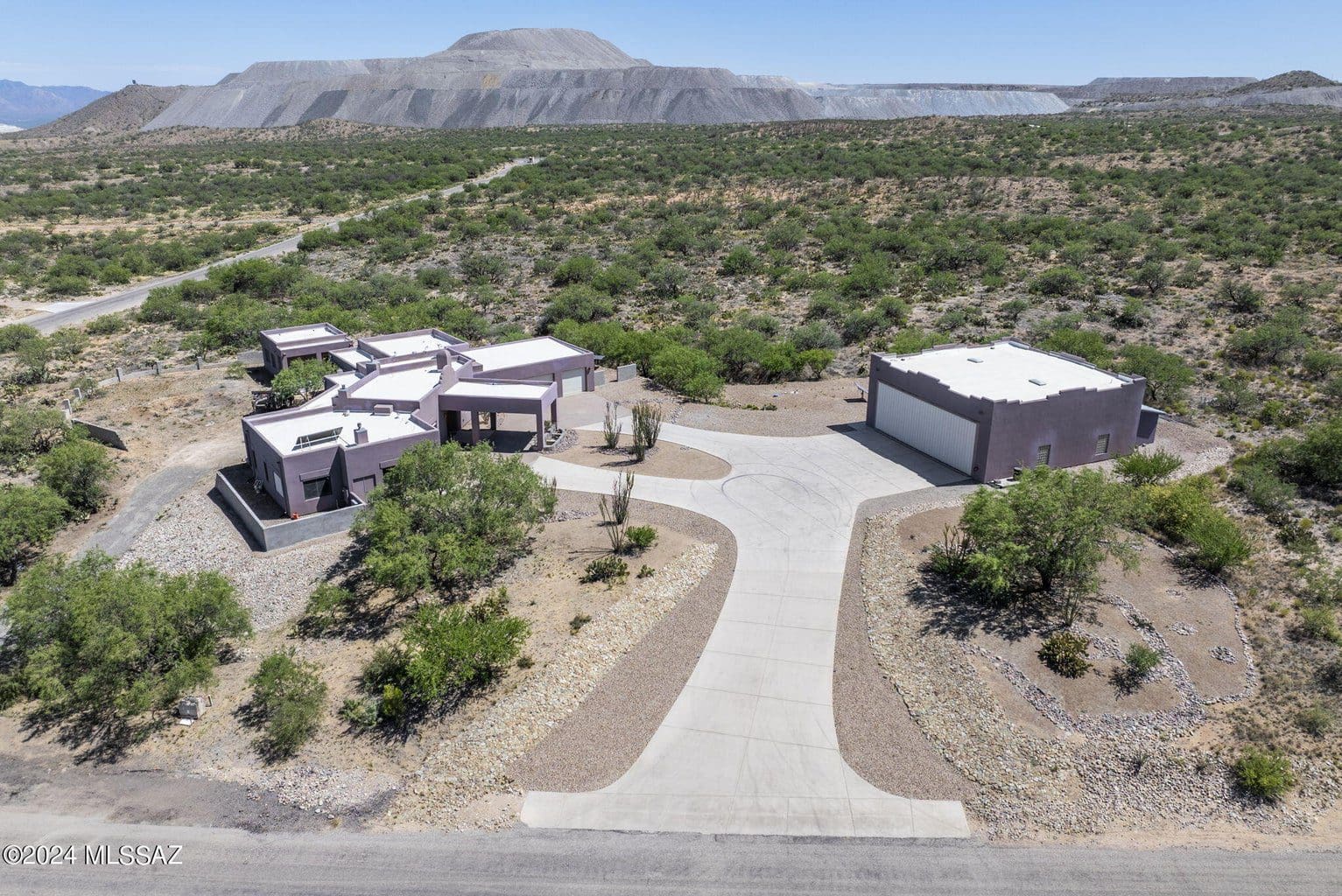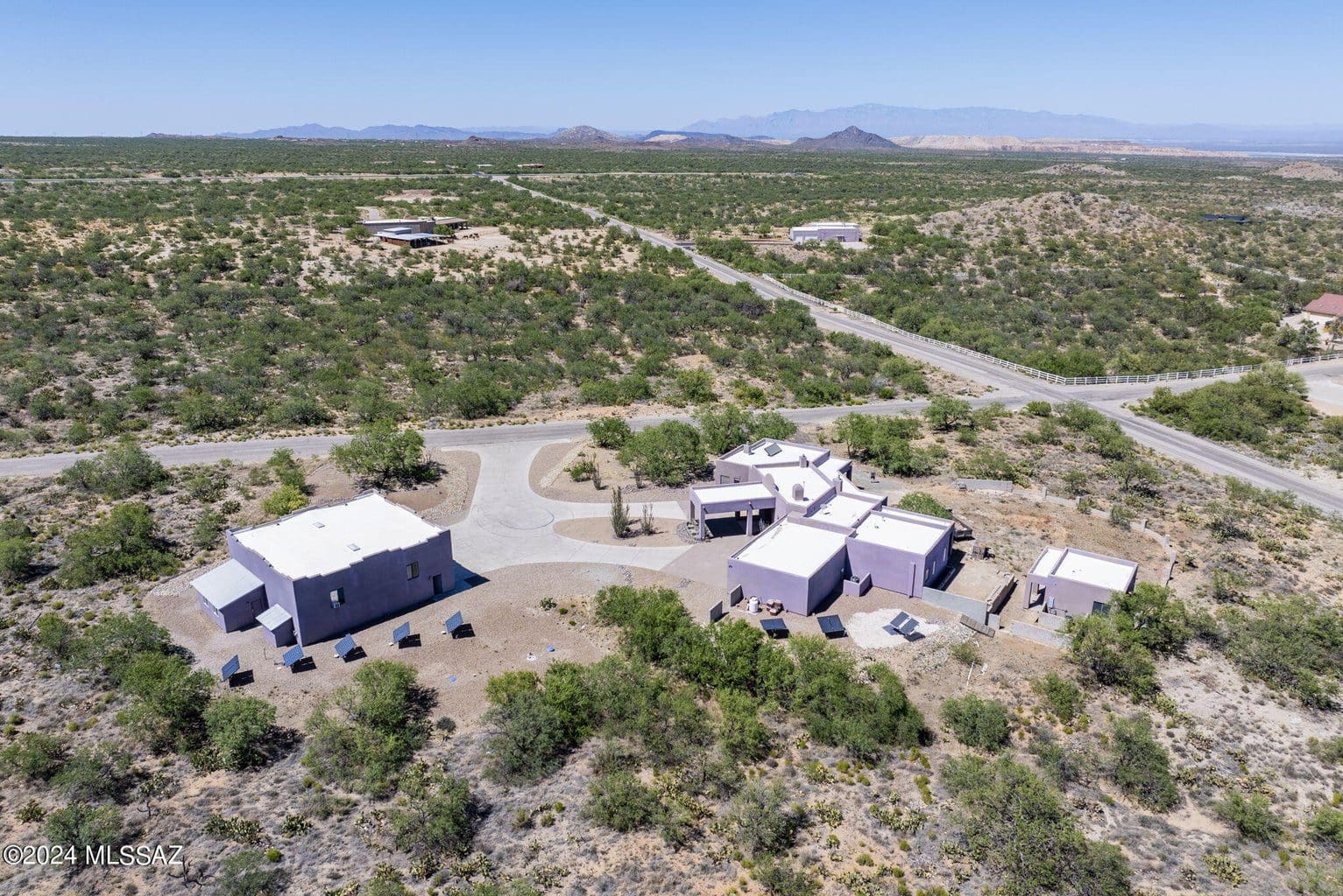 All the faucets are made by Hansgrohe. The mirror is also custom made. Enjoy the jetted tub or walk into the shower with privacy glass. Enjoy the year-round comfort with a new Trane HVAC system, solar water heating in the main house, and tankless water heating in the casita. The casita has a kitchen and full bathroom for your guests to enjoy, and of course all custom built. Enjoy the back yard by walking through the 16ft pocket doors into the backyard patio area, where you will have a built-in BBQ, smoker, and a fridge. There are three fireplaces where you can choose to relax. Enjoy the 2,500 sq. ft. hangar for storage from an RV to an Airplane. There is also a large workshop. No need to go inside the main house for cleaning up from a day in the shop, as there is a full bathroom in the hangar. You will own the 16 300-watt solar panels that are mounted on a dual axis tracker, generating an impressive 6.24kw of power, resulting in amazing savings with electricity. The estate has electric rolling security shutters, and is in a gated community. You will have a water filtration system that will provide you with all you need for your water harvesting system. The estate has zoned heating and cooling as well as a central vac, making cleaning a breeze. Additional amenities include a portico, 3-car garage, electric car charger, a 100 gallon propane tank that supplies the BBQ and fireplaces, as the home is all electric. The wall inside the home by the garage man door is also plumbed for a water-fall feature. This home was built with SIP PANEL. The home has so many hidden luxuries for example a Compass Rose that is built into the flooring. This is the way to live in extreme luxury of your dream home.