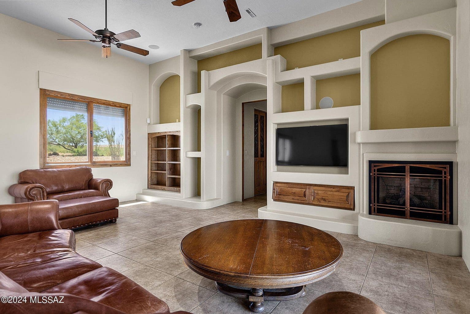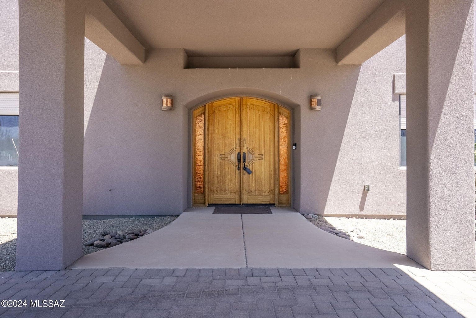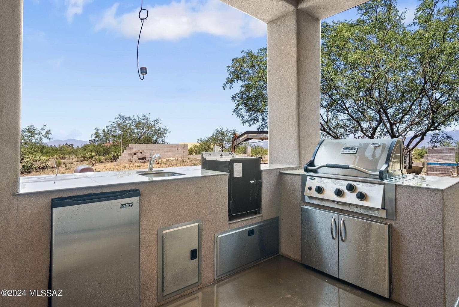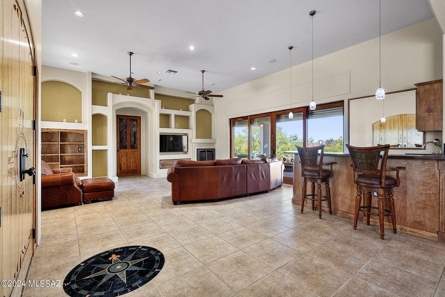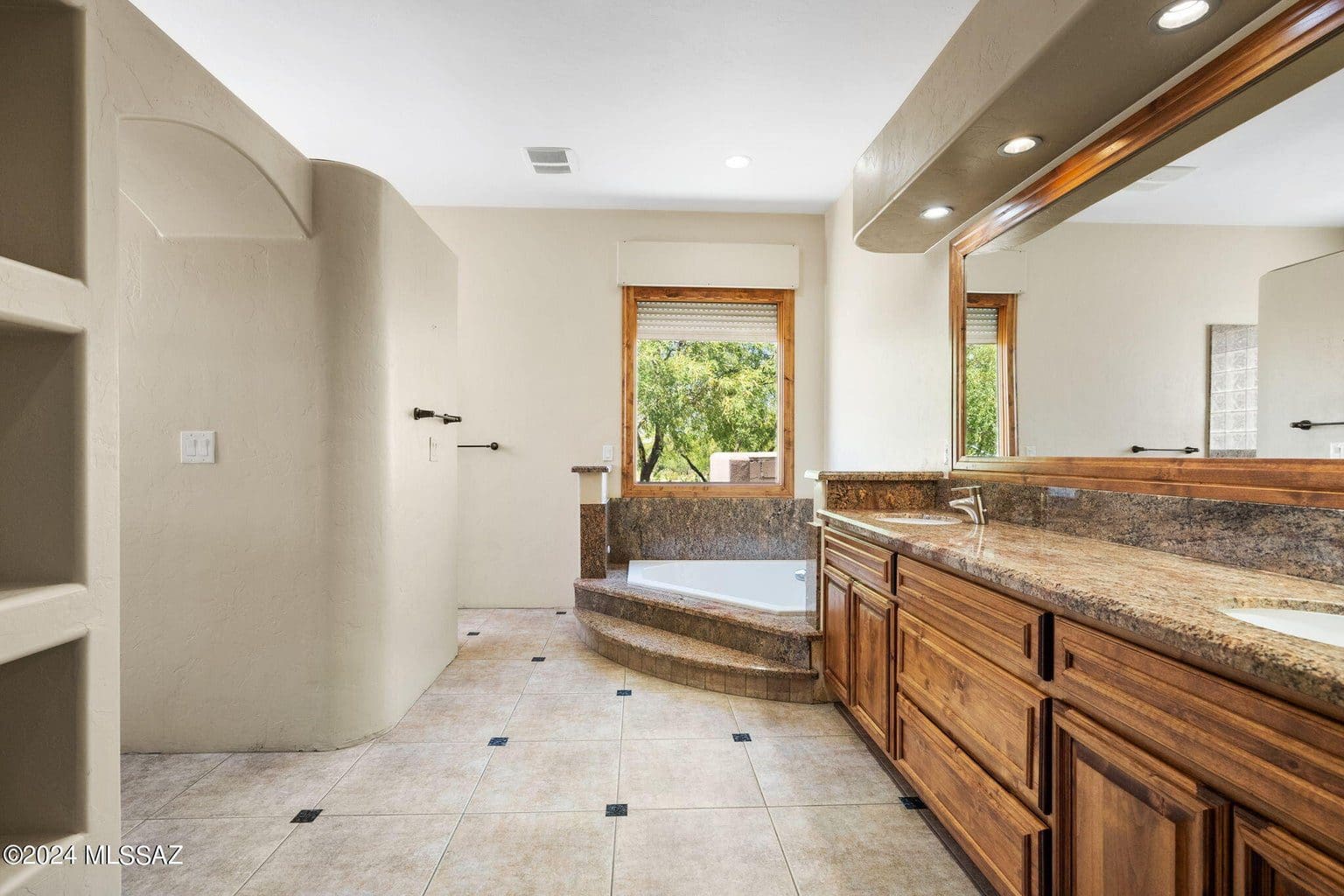 All the faucets are made by Hansgrohe. The mirror is also custom made. Enjoy the jetted tub or walk into the shower with privacy glass. Enjoy the year-round comfort with a new Trane HVAC system, solar water heating in the main house, and tankless water heating in the casita. The casita has a kitchen and full bathroom for your guests to enjoy, and of course all custom built. Enjoy the back yard by walking through the 16ft pocket doors into the backyard patio area, where you will have a built-in BBQ, smoker, and a fridge. There are three fireplaces where you can choose to relax. Enjoy the 2,500 sq. ft. hangar for storage from an RV to an Airplane. There is also a large workshop. No need to go inside the main house for cleaning up from a day in the shop, as there is a full bathroom in the hangar. You will own the 16 300-watt solar panels that are mounted on a dual axis tracker, generating an impressive 6.24kw of power, resulting in amazing savings with electricity. The estate has electric rolling security shutters, and is in a gated community. You will have a water filtration system that will provide you with all you need for your water harvesting system. The estate has zoned heating and cooling as well as a central vac, making cleaning a breeze. Additional amenities include a portico, 3-car garage, electric car charger, a 100 gallon propane tank that supplies the BBQ and fireplaces, as the home is all electric. The wall inside the home by the garage man door is also plumbed for a water-fall feature. This home was built with SIP PANEL. The home has so many hidden luxuries for example a Compass Rose that is built into the flooring. This is the way to live in extreme luxury of your dream home.