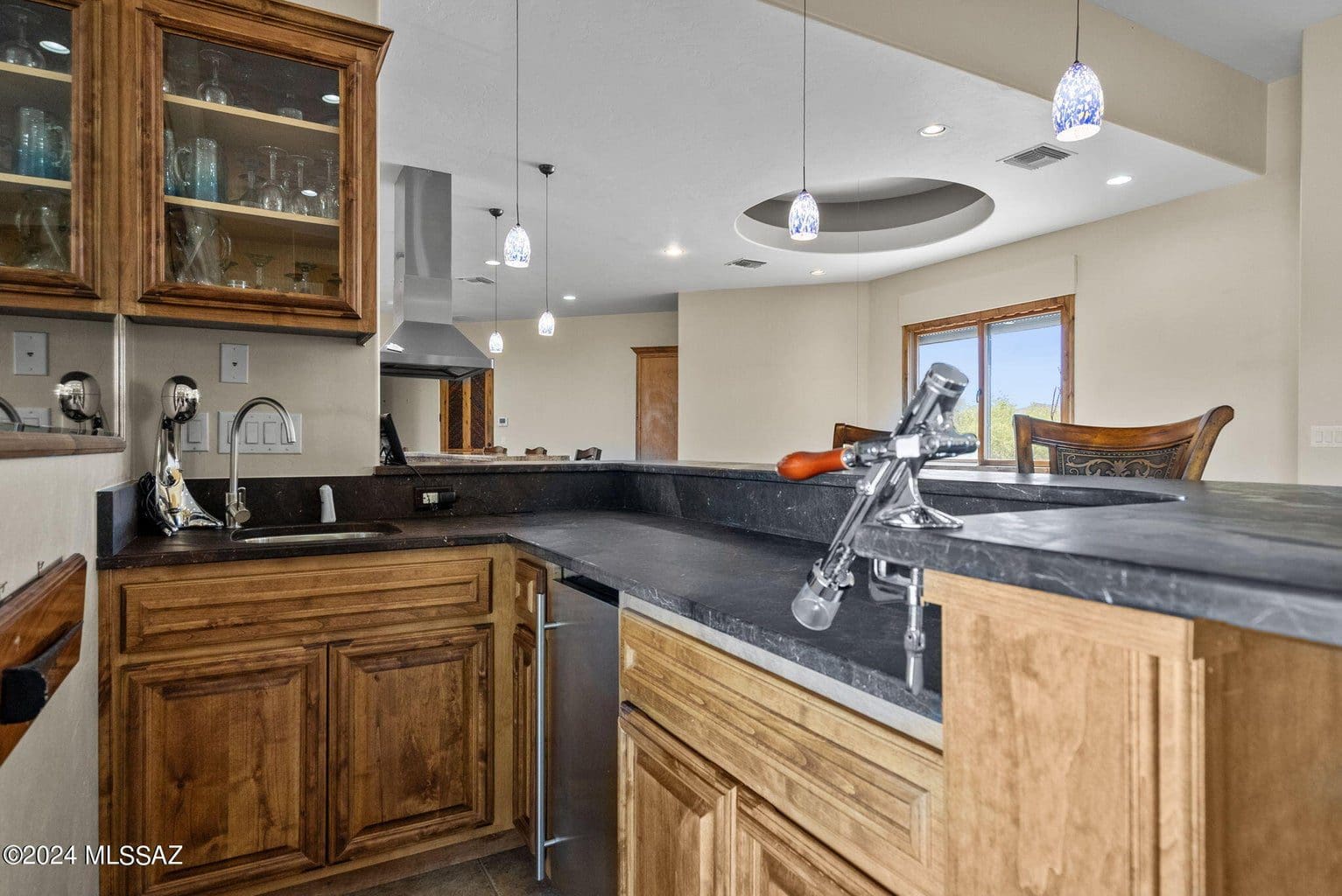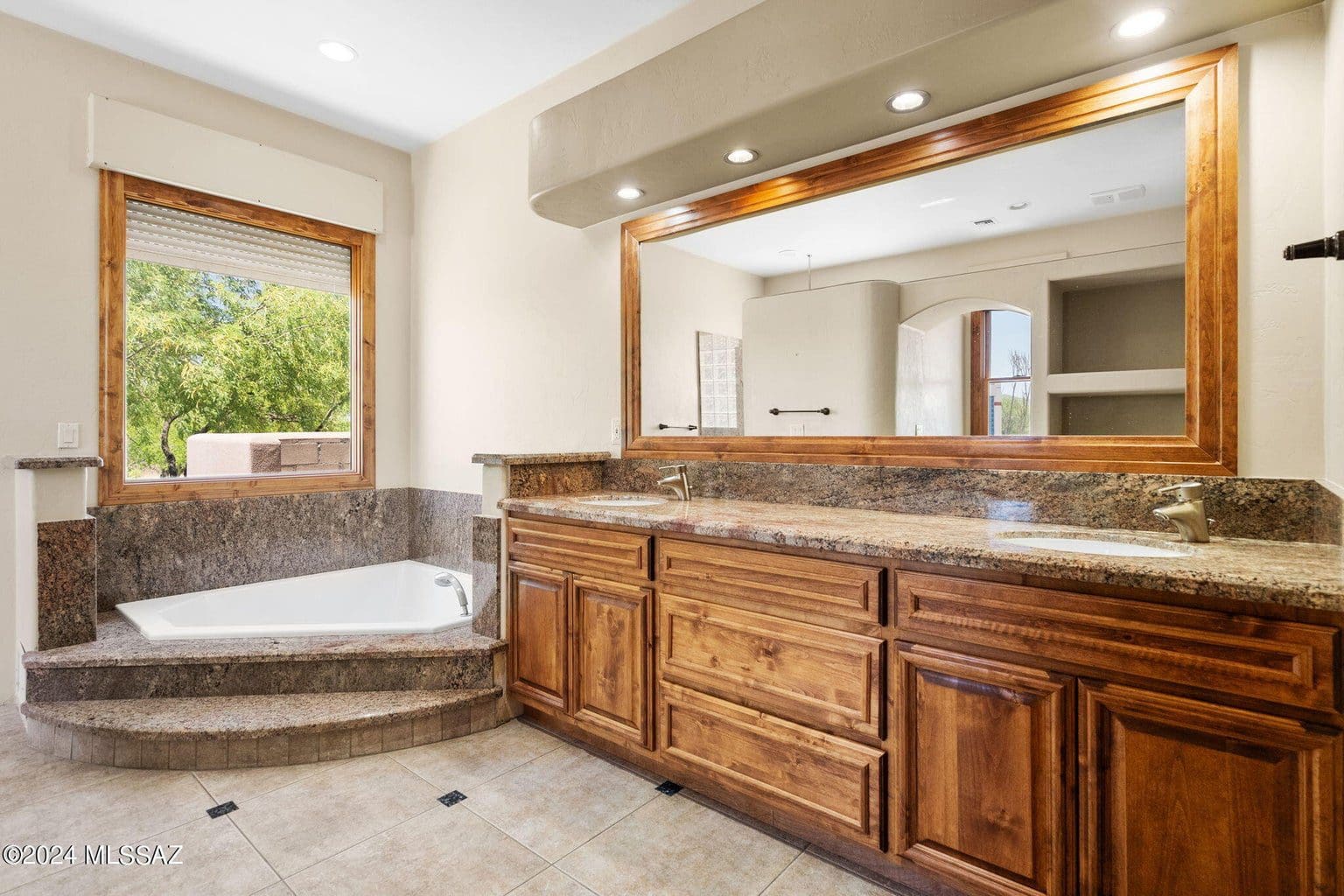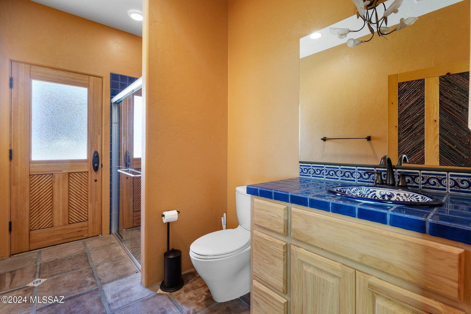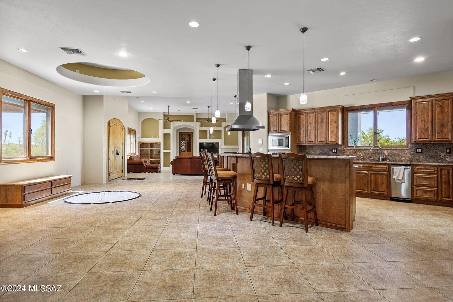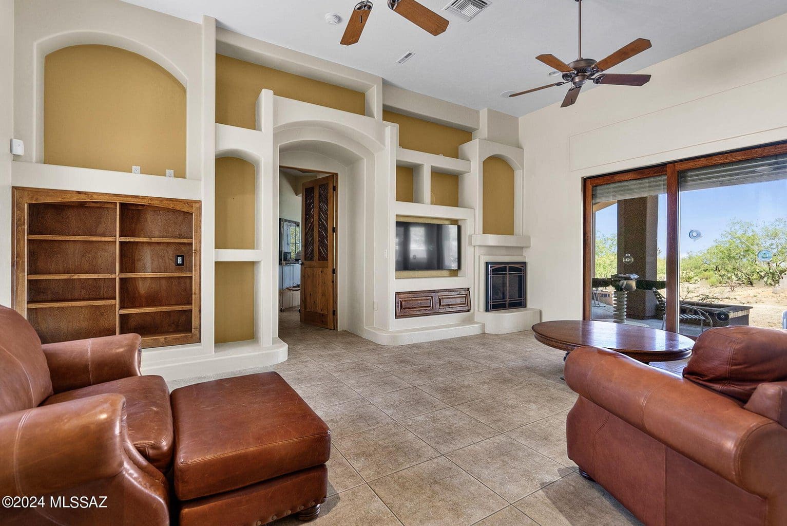 All the faucets are made by Hansgrohe. The mirror is also custom made. Enjoy the jetted tub or walk into the shower with privacy glass. Enjoy the year-round comfort with a new Trane HVAC system, solar water heating in the main house, and tankless water heating in the casita. The casita has a kitchen and full bathroom for your guests to enjoy, and of course all custom built. Enjoy the back yard by walking through the 16ft pocket doors into the backyard patio area, where you will have a built-in BBQ, smoker, and a fridge. There are three fireplaces where you can choose to relax. Enjoy the 2,500 sq. ft. hangar for storage from an RV to an Airplane. There is also a large workshop. No need to go inside the main house for cleaning up from a day in the shop, as there is a full bathroom in the hangar. You will own the 16 300-watt solar panels that are mounted on a dual axis tracker, generating an impressive 6.24kw of power, resulting in amazing savings with electricity. The estate has electric rolling security shutters, and is in a gated community. You will have a water filtration system that will provide you with all you need for your water harvesting system. The estate has zoned heating and cooling as well as a central vac, making cleaning a breeze. Additional amenities include a portico, 3-car garage, electric car charger, a 100 gallon propane tank that supplies the BBQ and fireplaces, as the home is all electric. The wall inside the home by the garage man door is also plumbed for a water-fall feature. This home was built with SIP PANEL. The home has so many hidden luxuries for example a Compass Rose that is built into the flooring. This is the way to live in extreme luxury of your dream home.