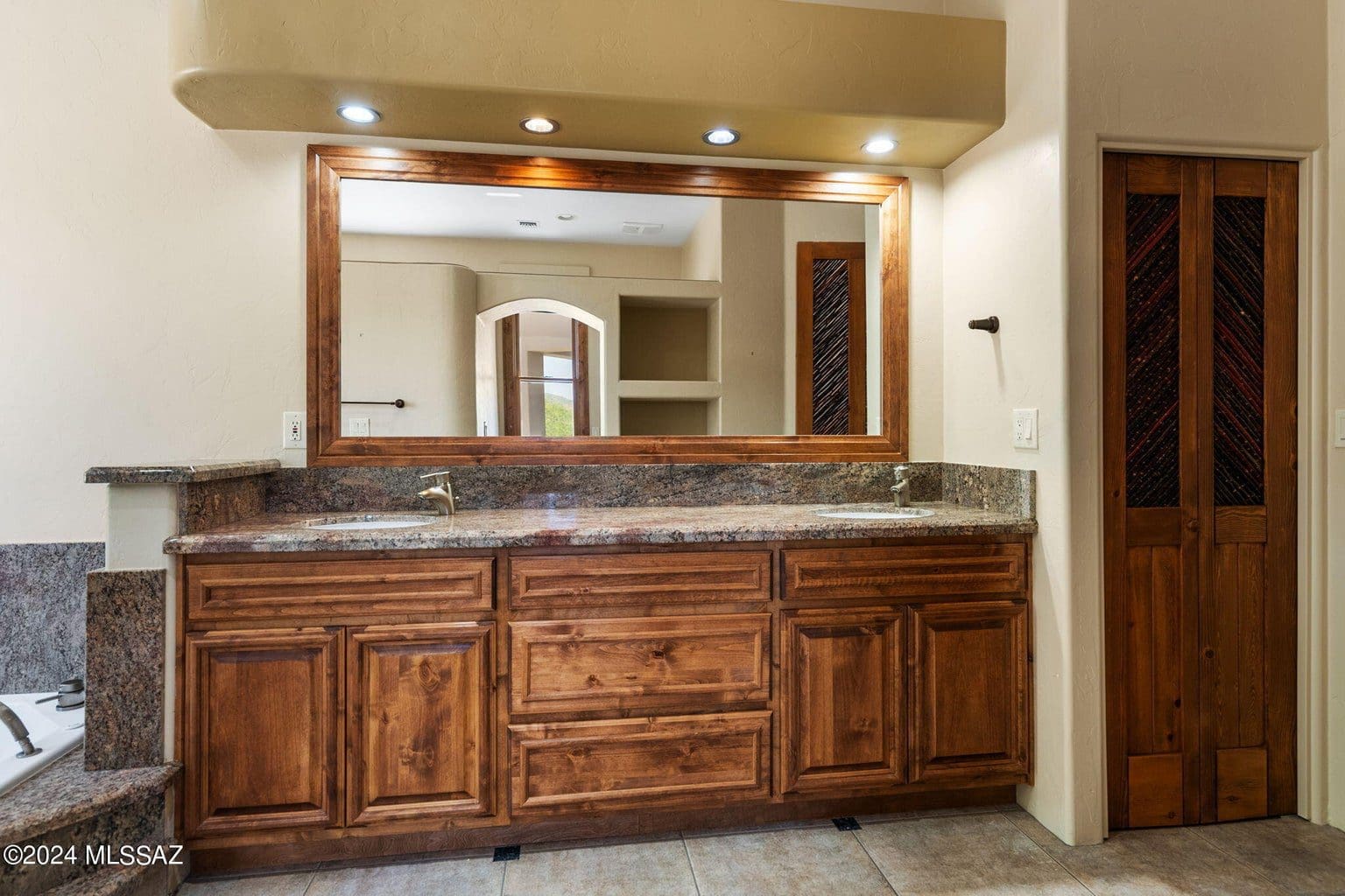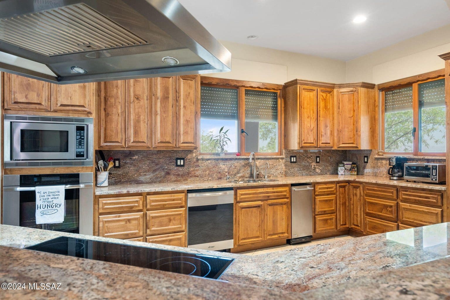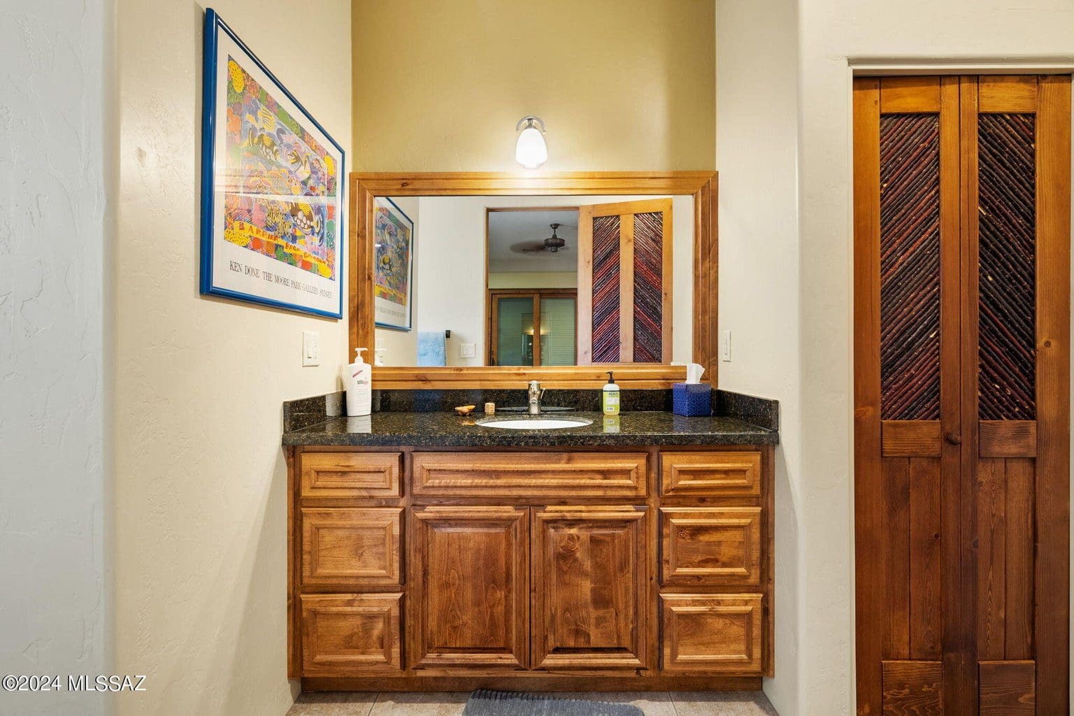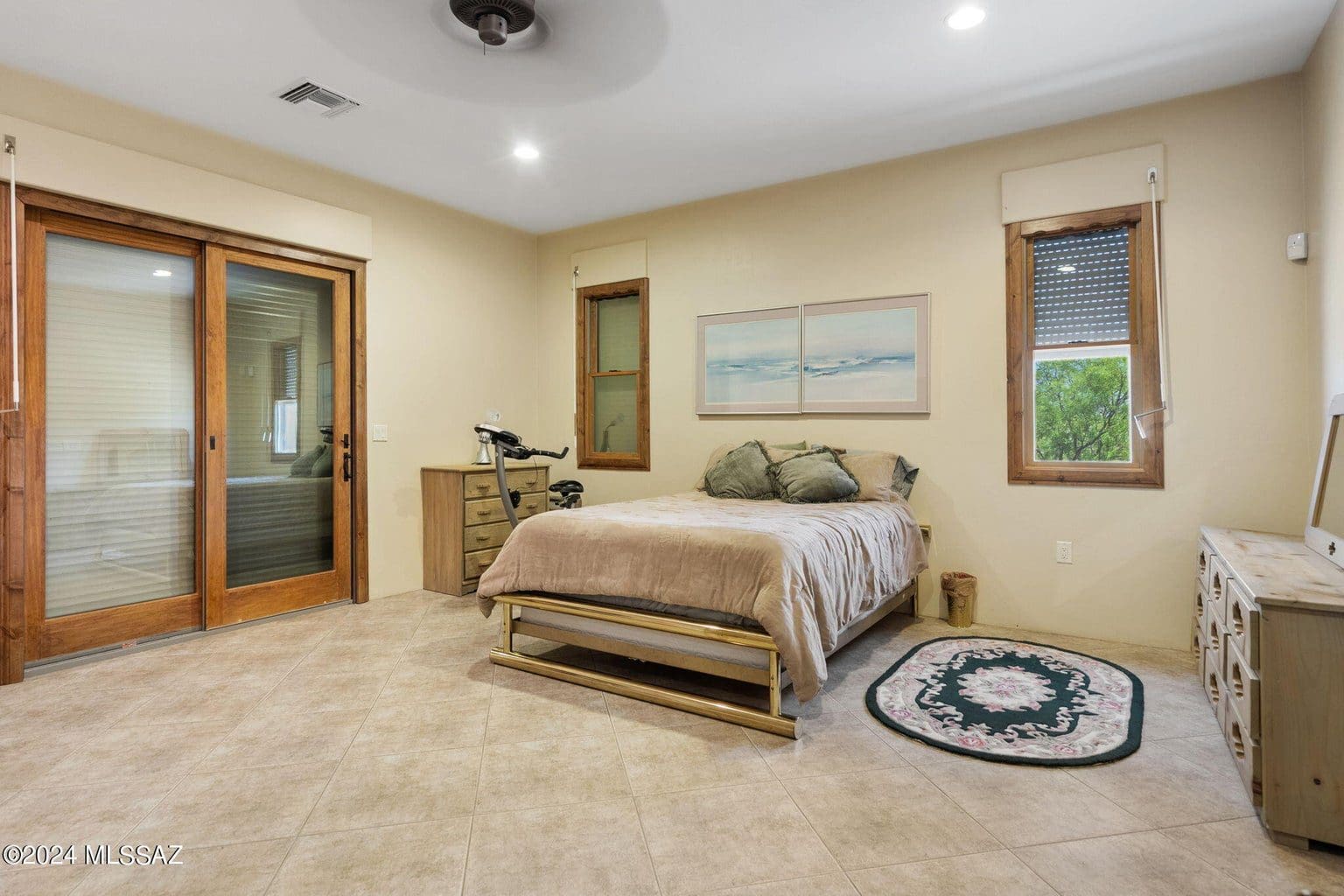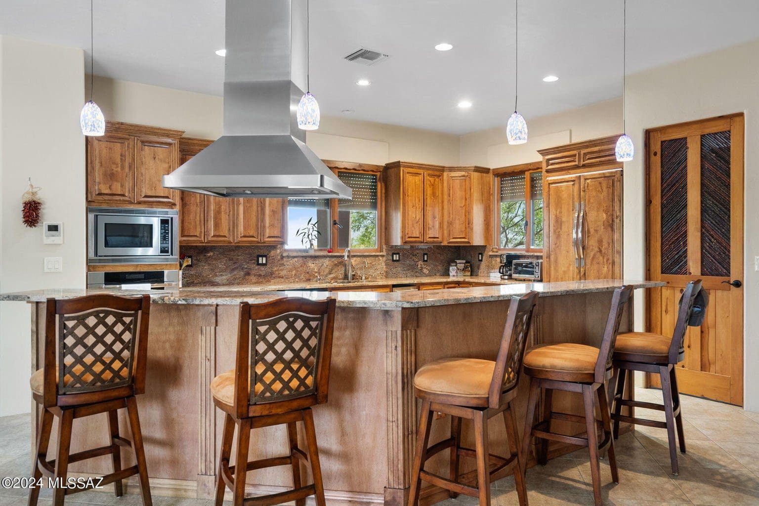 All the faucets are made by Hansgrohe. The mirror is also custom made. Enjoy the jetted tub or walk into the shower with privacy glass. Enjoy the year-round comfort with a new Trane HVAC system, solar water heating in the main house, and tankless water heating in the casita. The casita has a kitchen and full bathroom for your guests to enjoy, and of course all custom built. Enjoy the back yard by walking through the 16ft pocket doors into the backyard patio area, where you will have a built-in BBQ, smoker, and a fridge. There are three fireplaces where you can choose to relax. Enjoy the 2,500 sq. ft. hangar for storage from an RV to an Airplane. There is also a large workshop. No need to go inside the main house for cleaning up from a day in the shop, as there is a full bathroom in the hangar. You will own the 16 300-watt solar panels that are mounted on a dual axis tracker, generating an impressive 6.24kw of power, resulting in amazing savings with electricity. The estate has electric rolling security shutters, and is in a gated community. You will have a water filtration system that will provide you with all you need for your water harvesting system. The estate has zoned heating and cooling as well as a central vac, making cleaning a breeze. Additional amenities include a portico, 3-car garage, electric car charger, a 100 gallon propane tank that supplies the BBQ and fireplaces, as the home is all electric. The wall inside the home by the garage man door is also plumbed for a water-fall feature. This home was built with SIP PANEL. The home has so many hidden luxuries for example a Compass Rose that is built into the flooring. This is the way to live in extreme luxury of your dream home.