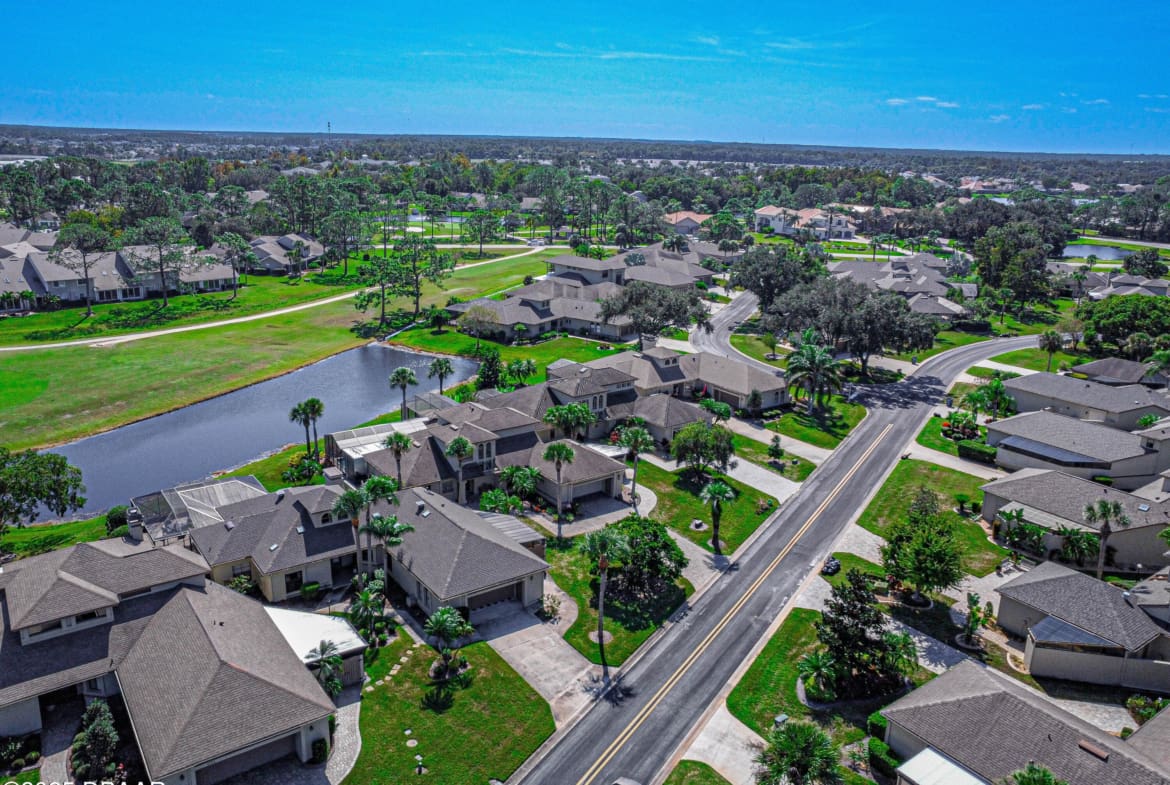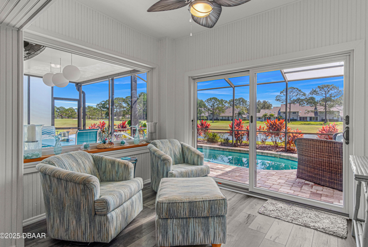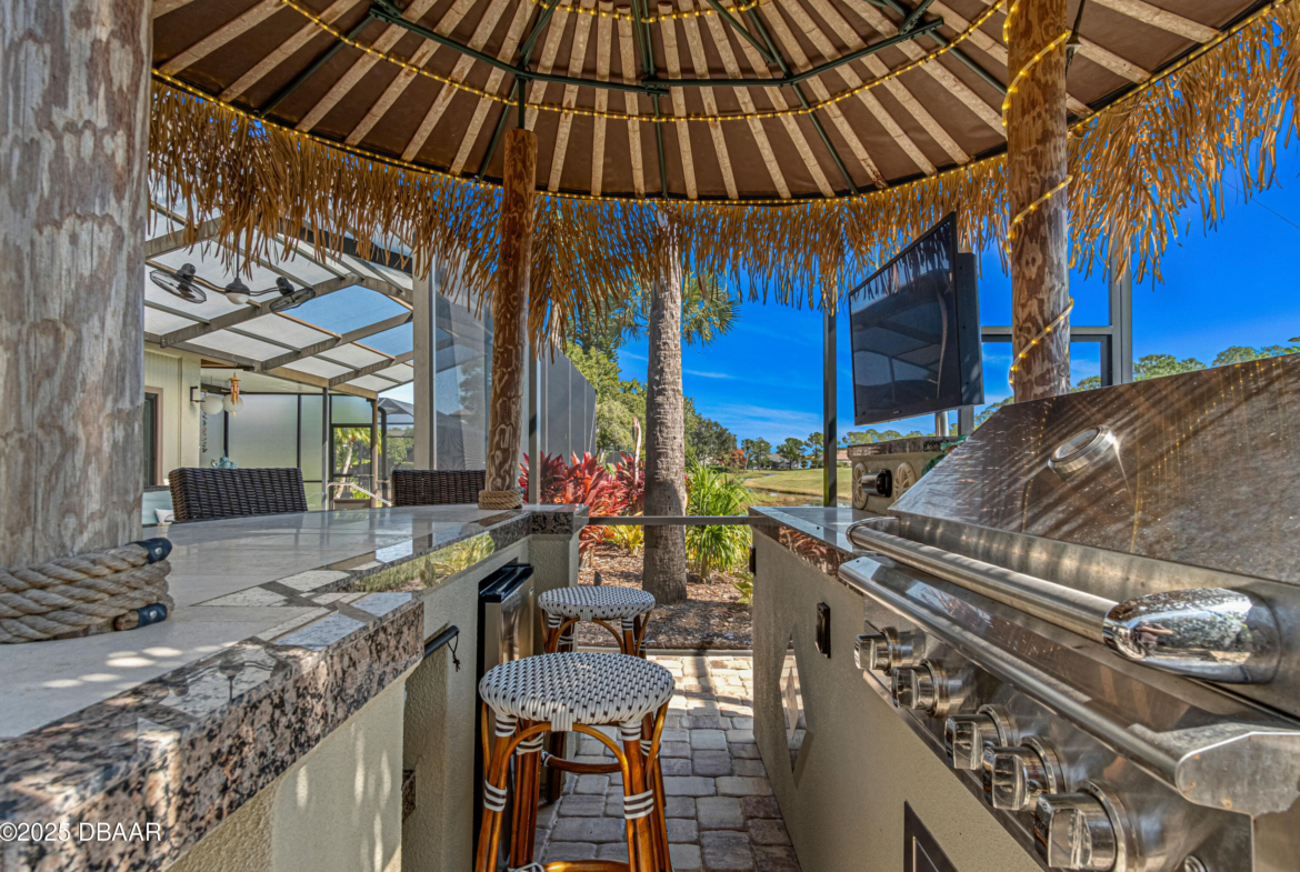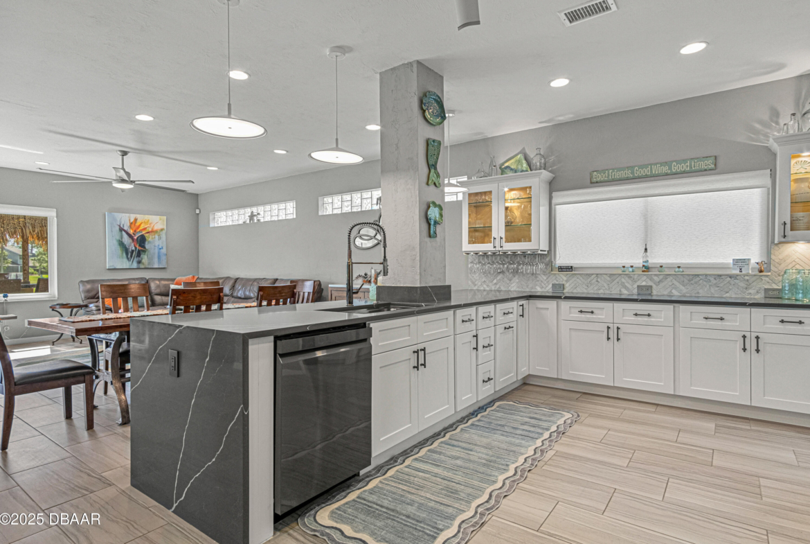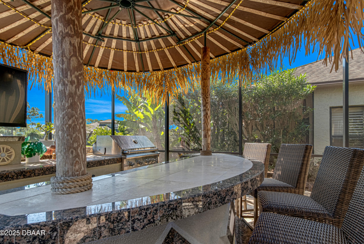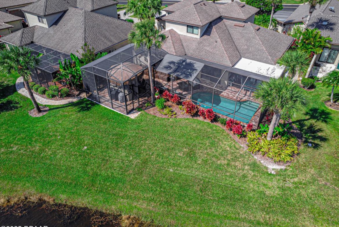 Stylish & Contemporary. Located in Spruce Creek Fly-In’s Wedgewood Community. Enjoy entertaining around your private unique tiki bar & pool overlooking relaxing pond with nature views. 3 bedroom 2 1/2 bath located on the golf course. High end kitchen remodel with custom cabinetry, quartz counter tops, eat in bar area, smart sink, pantry & new LG appliances. Sitting area/living room from foyer opens to sizable family room with bar/built in ice maker & tile flooring throughout overlooks the 14th fairway giving way to a screened in lanai w/ insulated aluminum roof & FL screen. Cozy sunroom offers large picture window, bead board paneling & walk out to pool where you will enjoy hosting friends around the festive tiki bar (includes bar stools, grill, refrigerator & lighting). Master suite provides a substantial custom built in closet, walk in shower w/ dual vanities, custom panel track blinds & slider to lanai. Separate guest quarters with full bath upstairs.