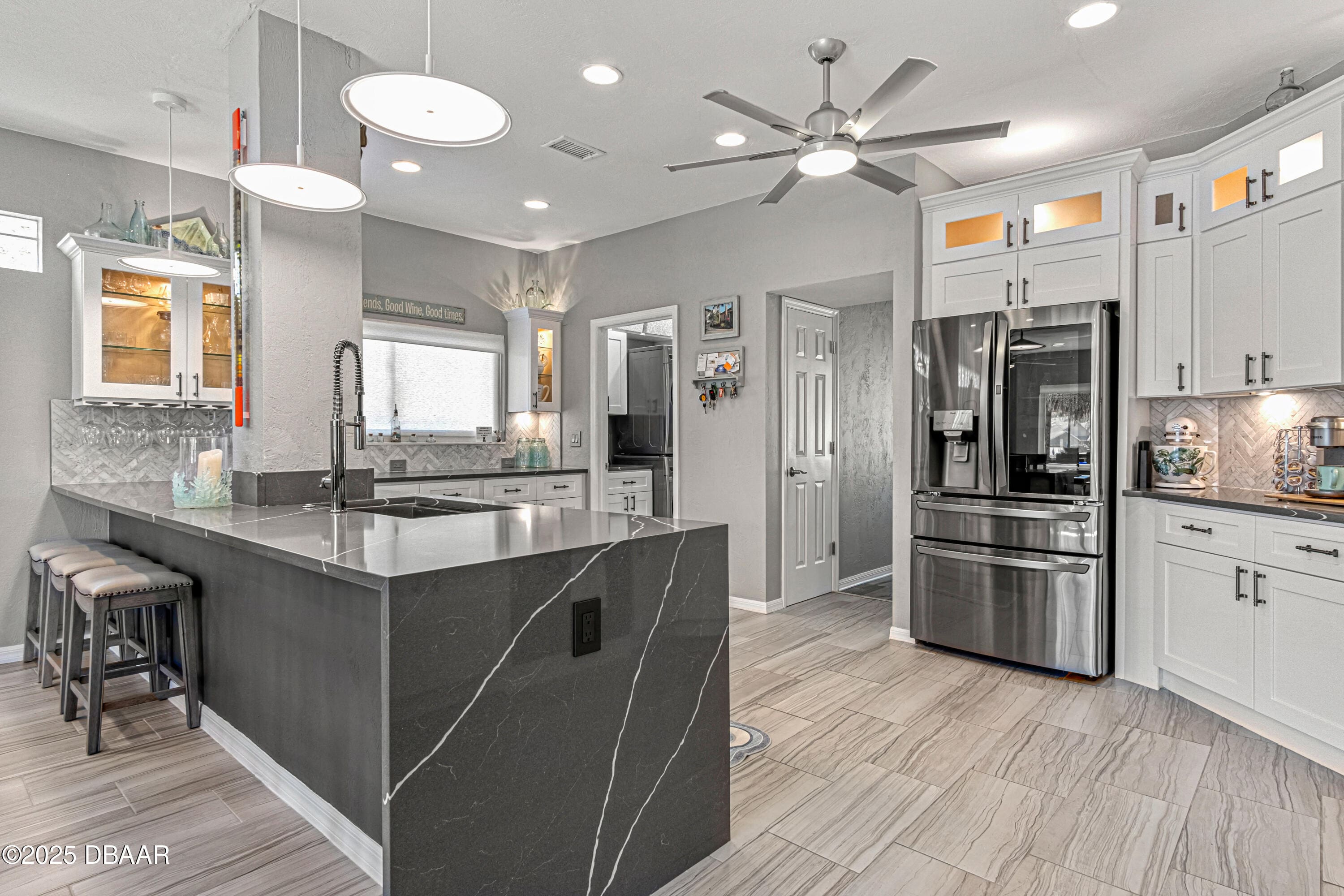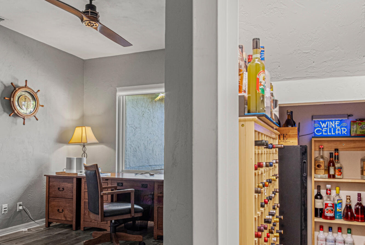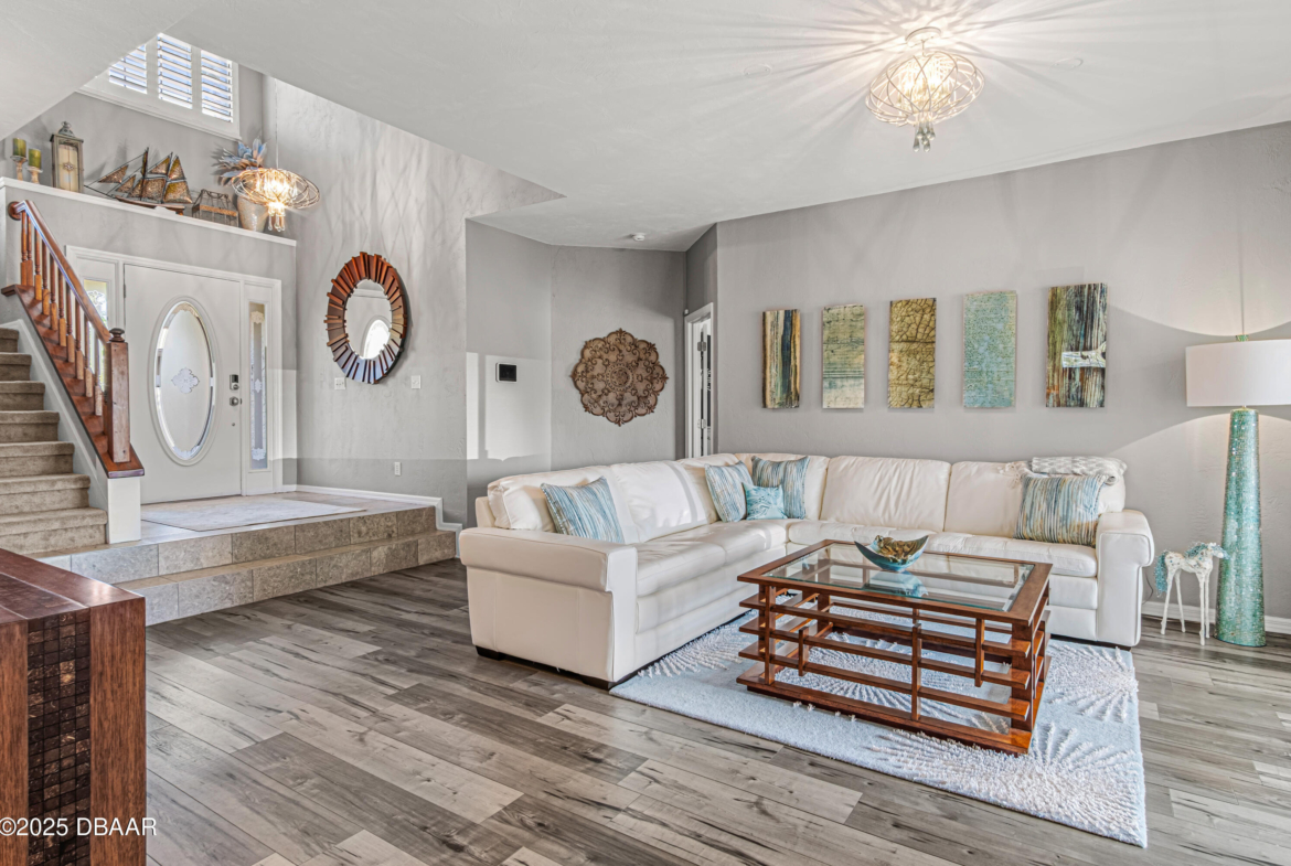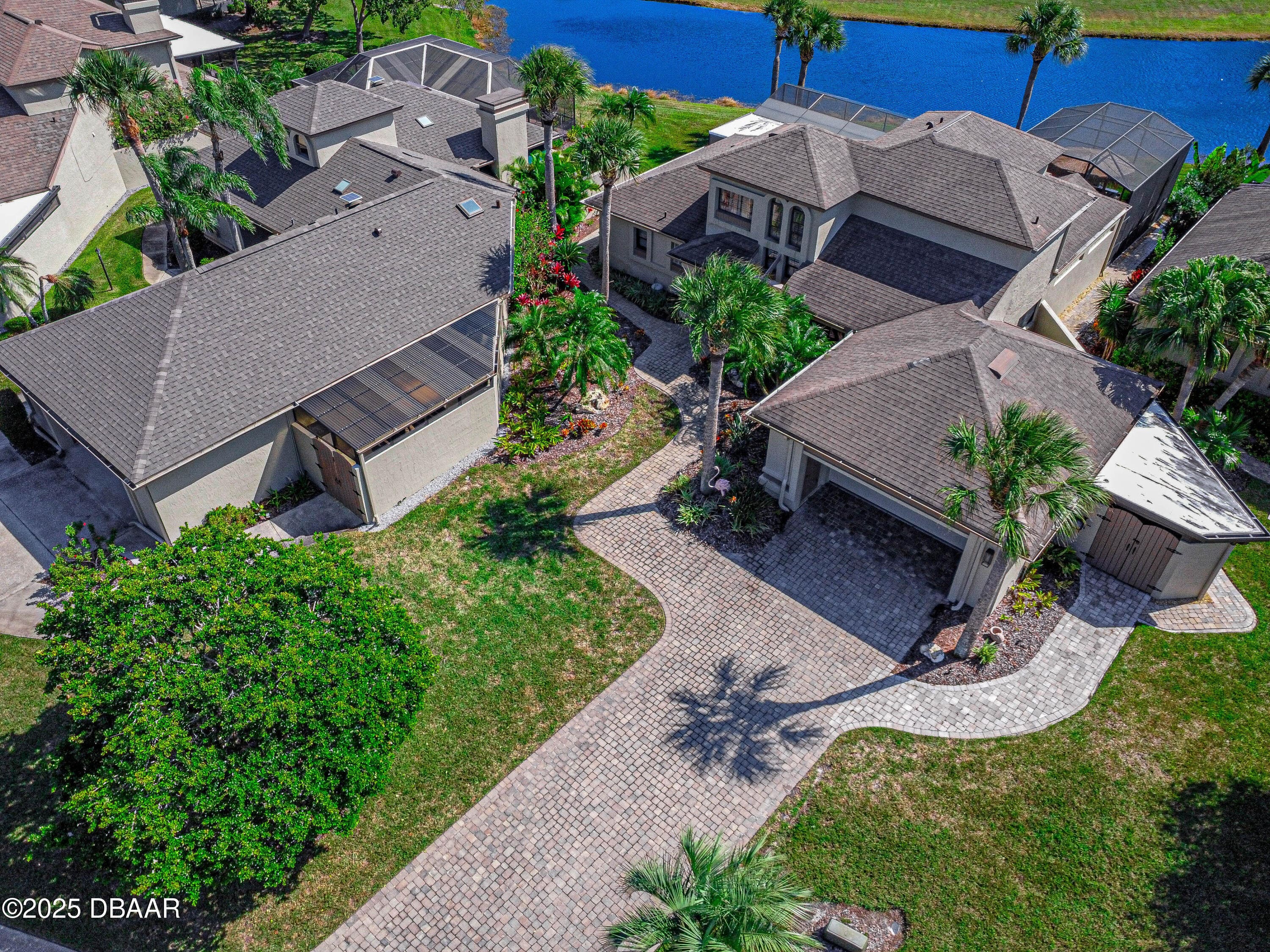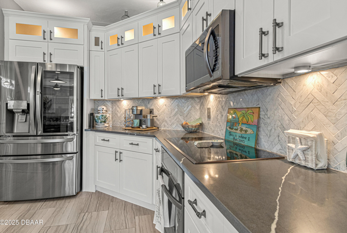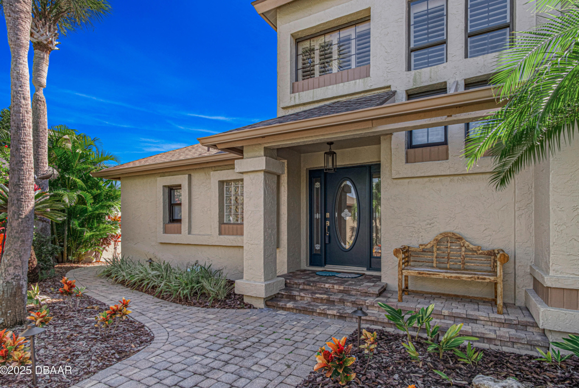 Stylish & Contemporary. Located in Spruce Creek Fly-In’s Wedgewood Community. Enjoy entertaining around your private unique tiki bar & pool overlooking relaxing pond with nature views. 3 bedroom 2 1/2 bath located on the golf course. High end kitchen remodel with custom cabinetry, quartz counter tops, eat in bar area, smart sink, pantry & new LG appliances. Sitting area/living room from foyer opens to sizable family room with bar/built in ice maker & tile flooring throughout overlooks the 14th fairway giving way to a screened in lanai w/ insulated aluminum roof & FL screen. Cozy sunroom offers large picture window, bead board paneling & walk out to pool where you will enjoy hosting friends around the festive tiki bar (includes bar stools, grill, refrigerator & lighting). Master suite provides a substantial custom built in closet, walk in shower w/ dual vanities, custom panel track blinds & slider to lanai. Separate guest quarters with full bath upstairs.